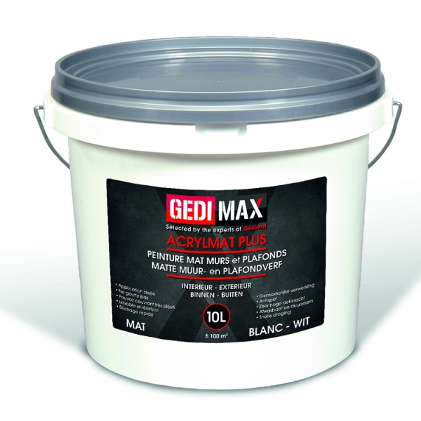 Peinture blanche mate en phase aqueuse pour une finition intérieure et extérieure soignée des murs et plafonds.